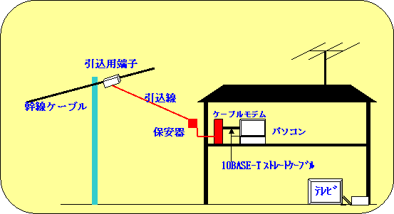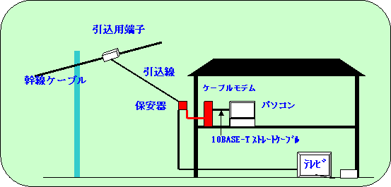 取り付け工事は保安機からケーブルモデムまでの配線とケーブルモデムの設置までです。 ケーブルモデムから先の配線及びLANアダプタの取り付けはお客様にお願いします。 |